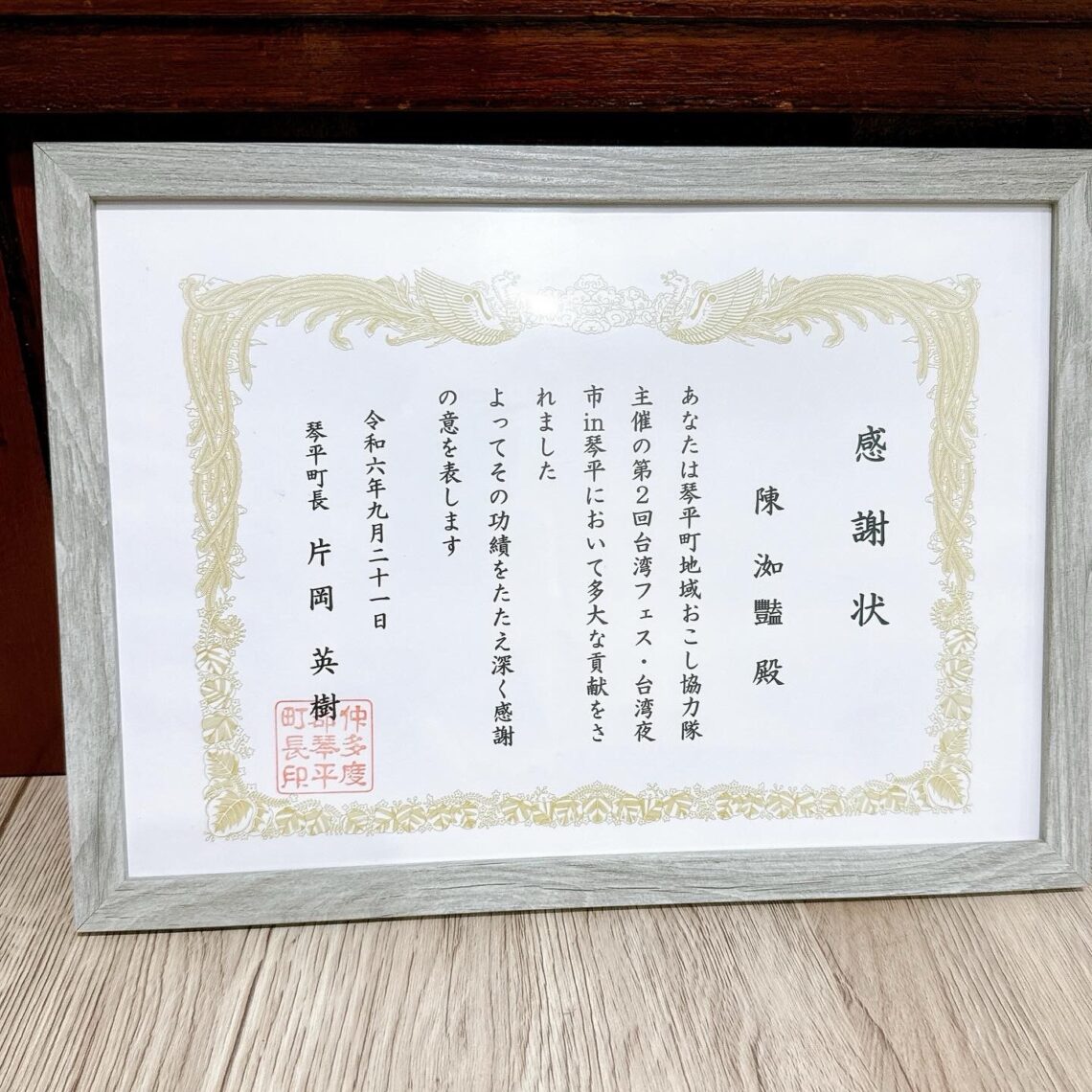 琴平町の町長から、「第2回台湾フェス・台湾夜市 in琴平」協力に対し感謝状を頂きました。這次因為協助四國琴平町主辦