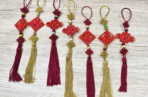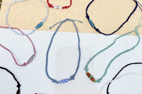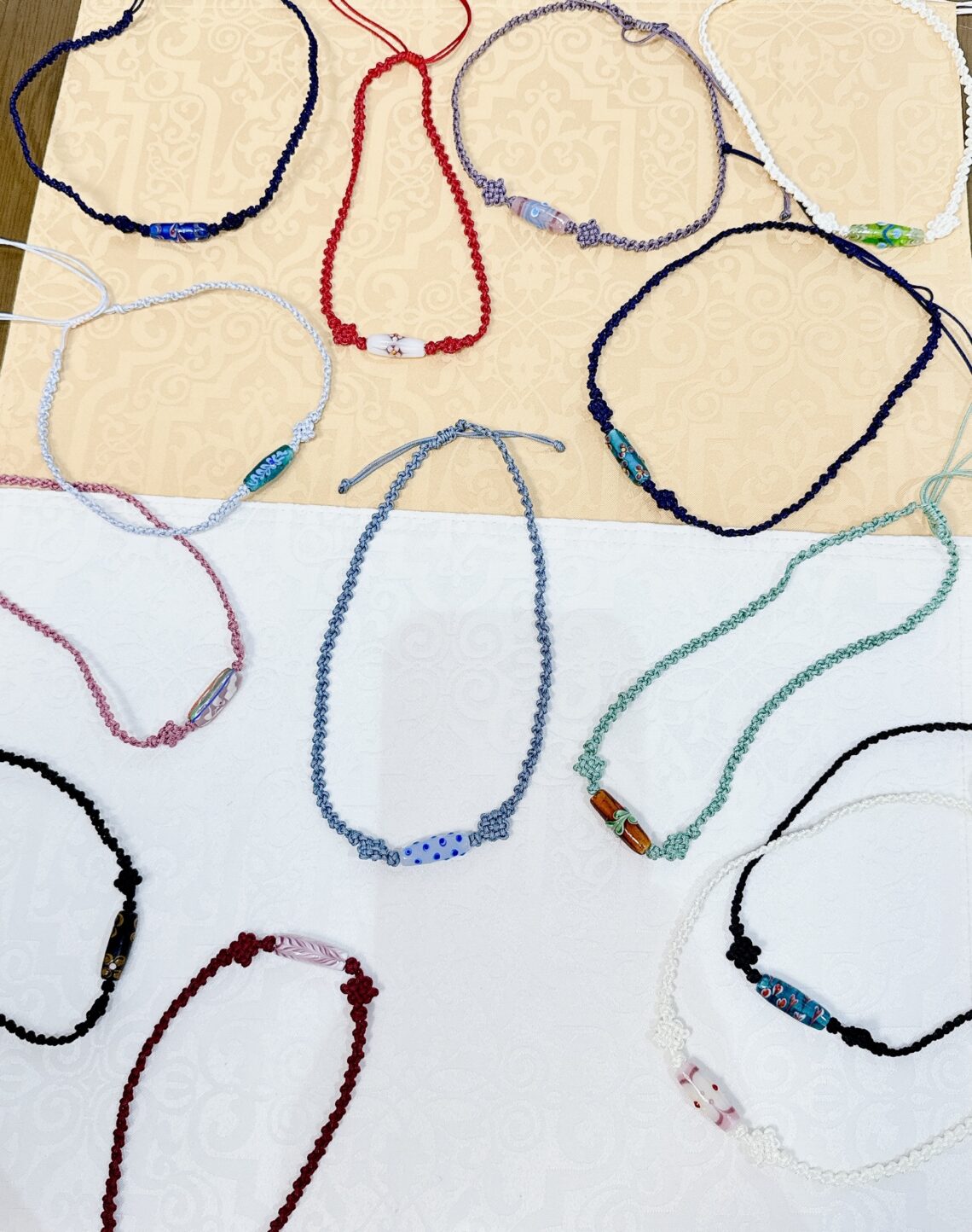 今日も中国結のワークショップを開催しました。今回は台湾三地門に住むパイワン族のトンボ玉を使ってネックレスを結びました。