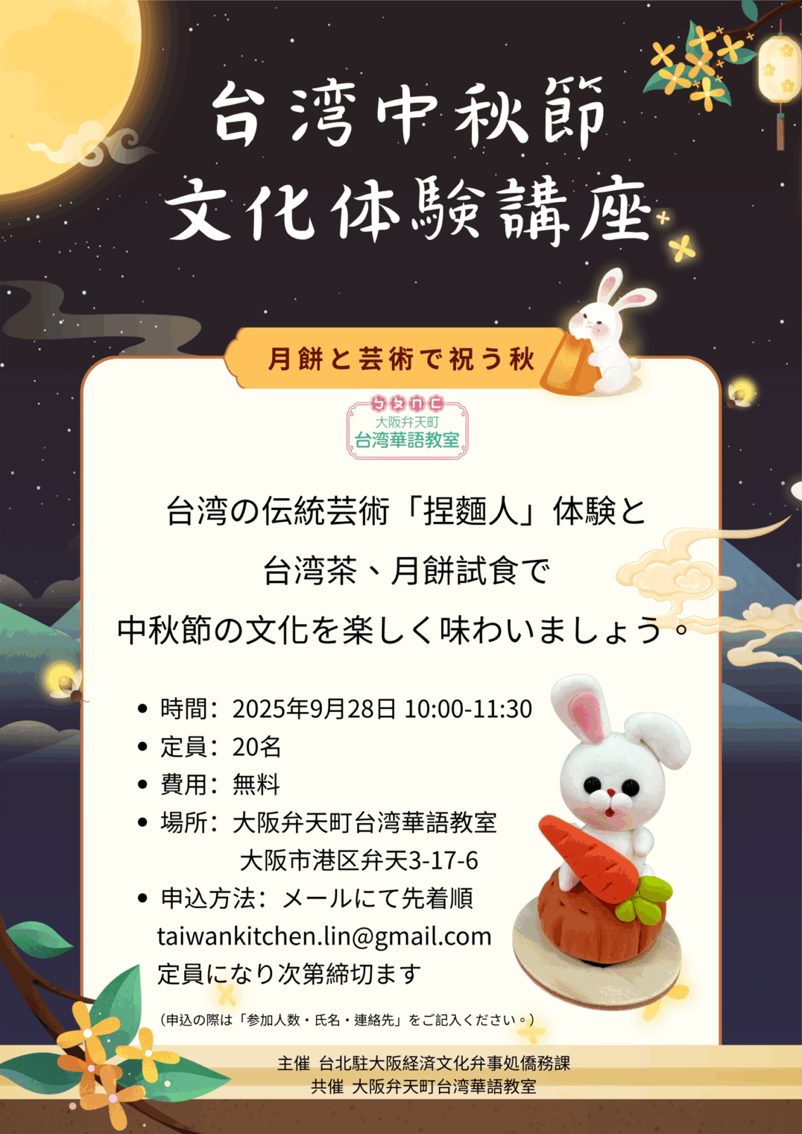 (申込の際は「参加人数・氏名・連絡先」をご記入ください。お子さまを同伴される場合は、お子さまの年齢 もご記入お願いします。)主催:台北駐大阪経済文化弁事処 僑務課