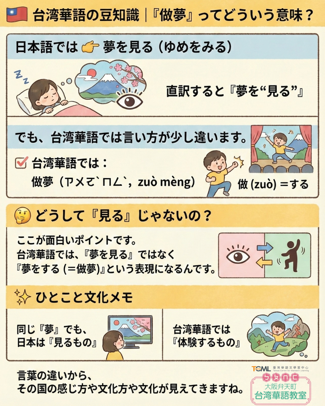 日本語では「夢を見る」と言いますが、台湾華語では